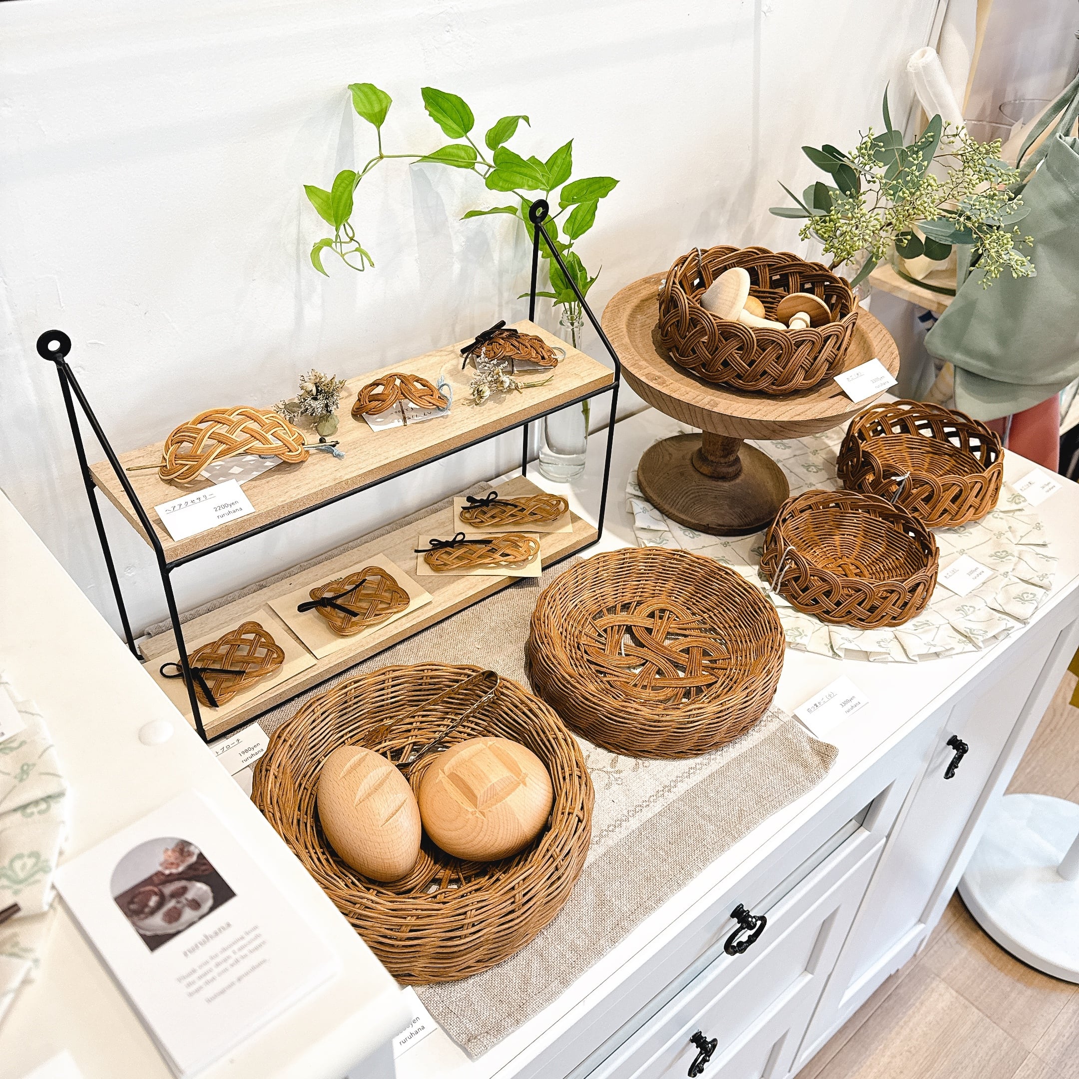 10月の1ヶ月間(〜11/1まで)刺繍道具展「Atelier アンナとラパン」での展示販売を行っている、藤でかごやアクセサリー、敷物などを編む作家さん、ruruhana(ルルハナ)さんの作品です。