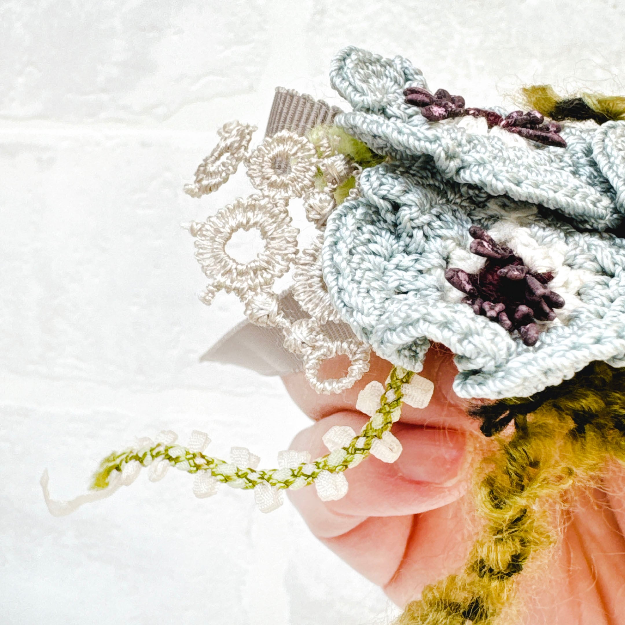 編み物ならではの暖かさのある、くすみカラーのコサージュ。