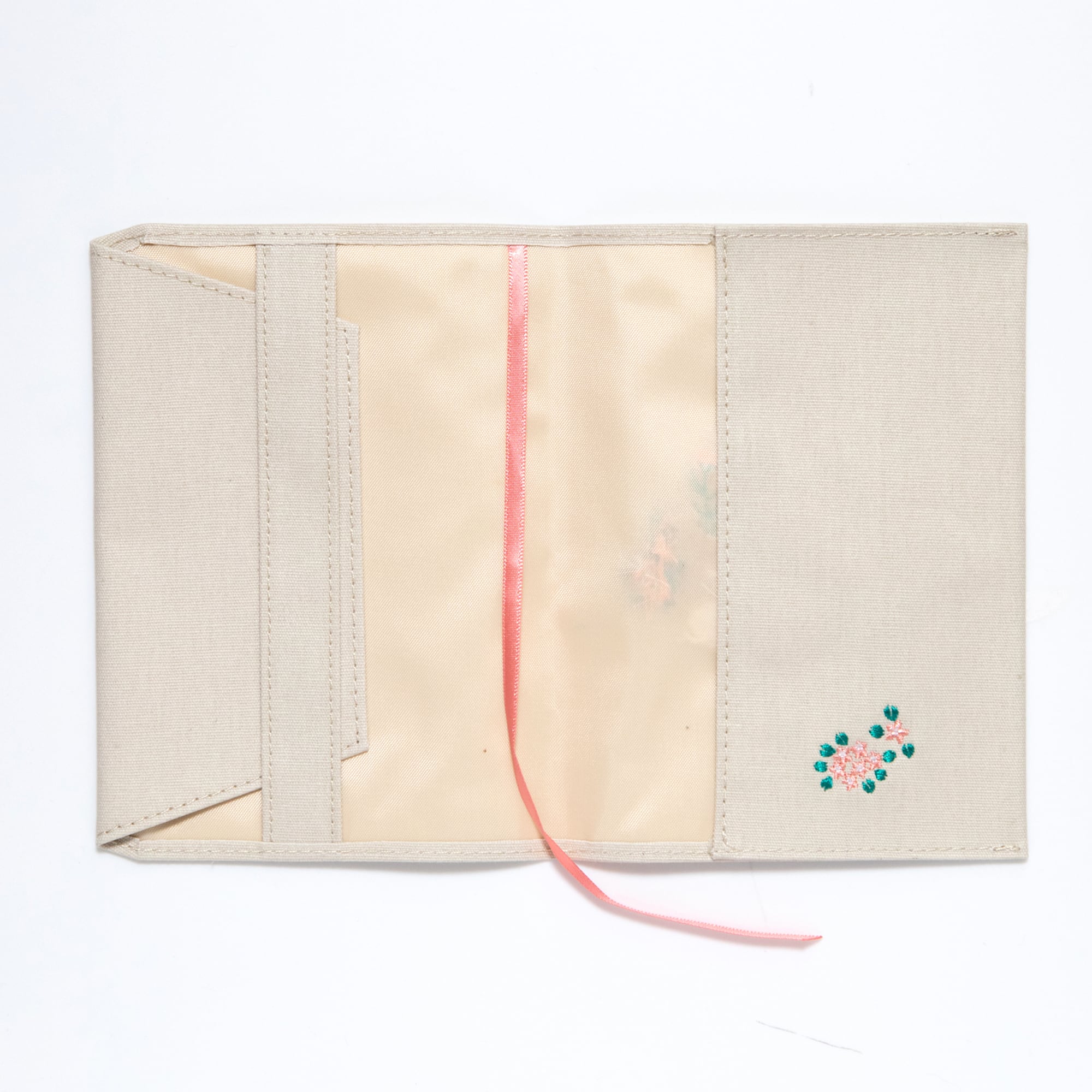 やさしい色合いの本体に、草花と動物の愛らしい刺繍が映えるブックカバーです。