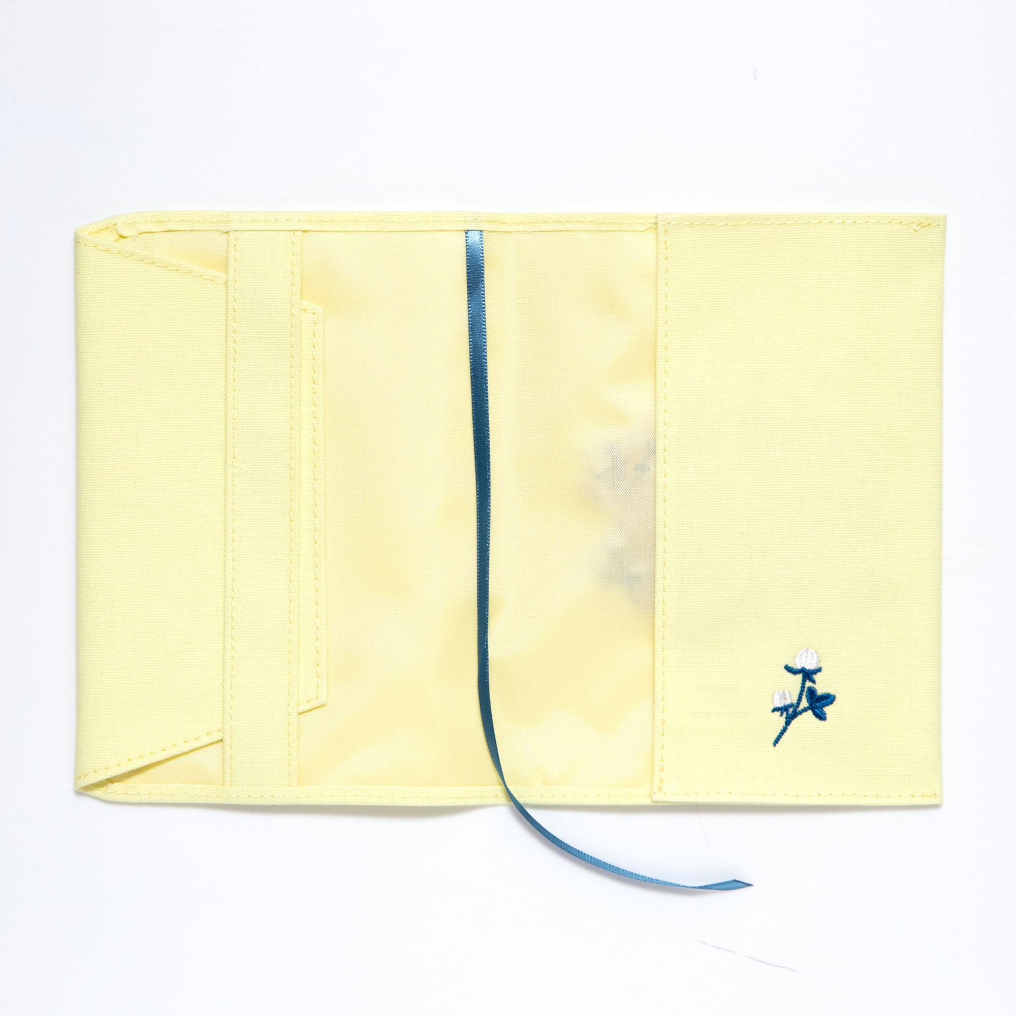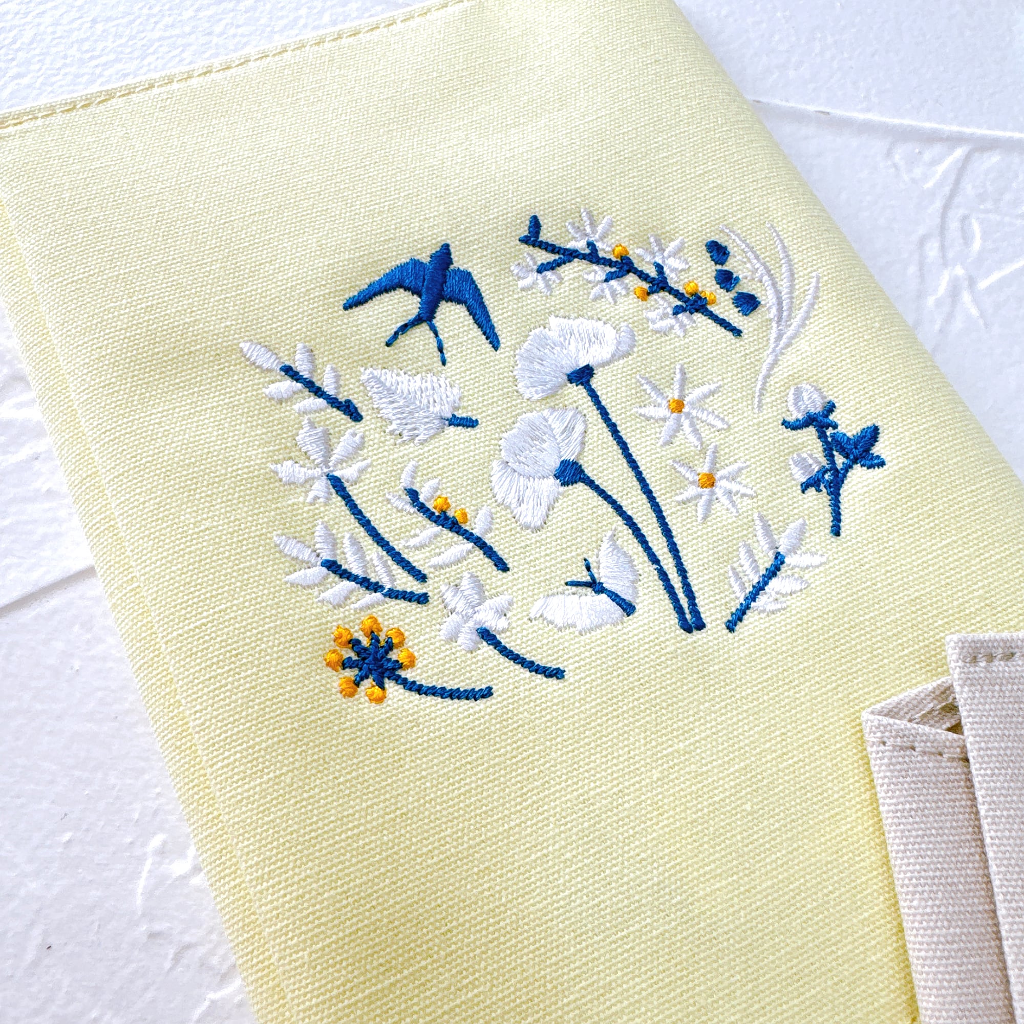 やさしい色合いの本体に、草花と動物の愛らしい刺繍が映えるブックカバーです。