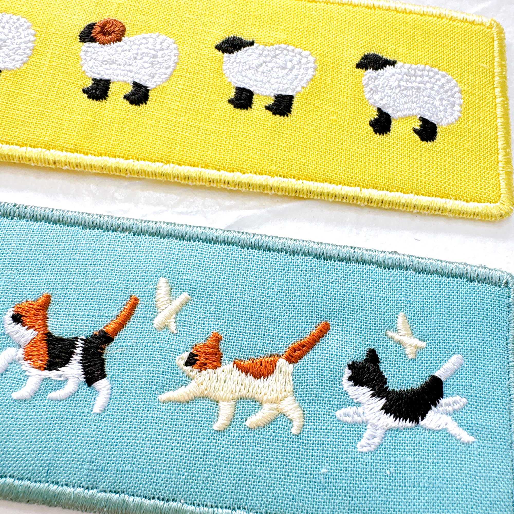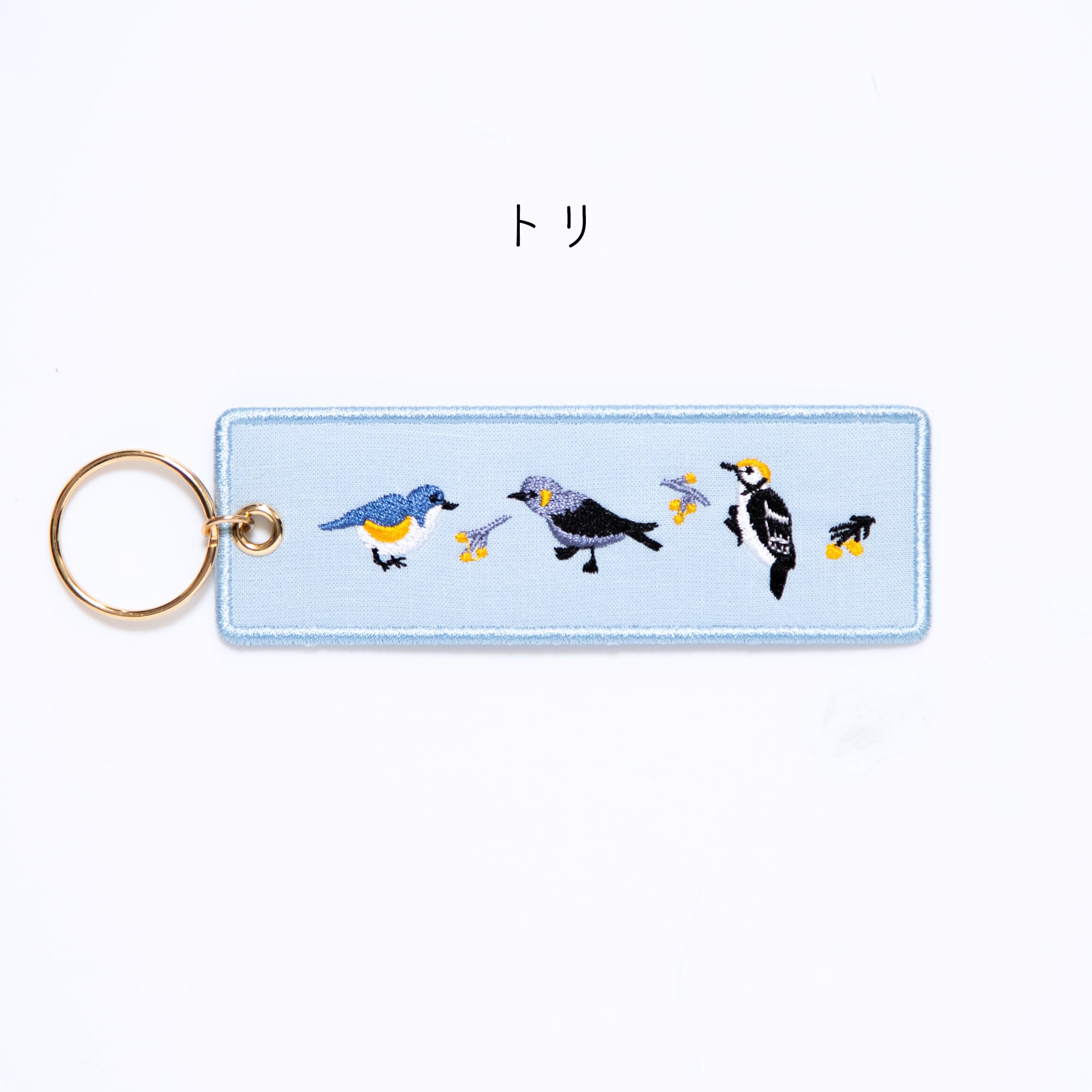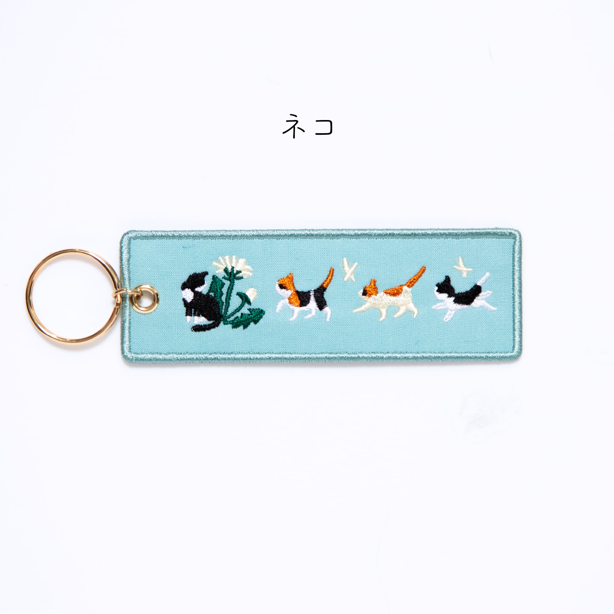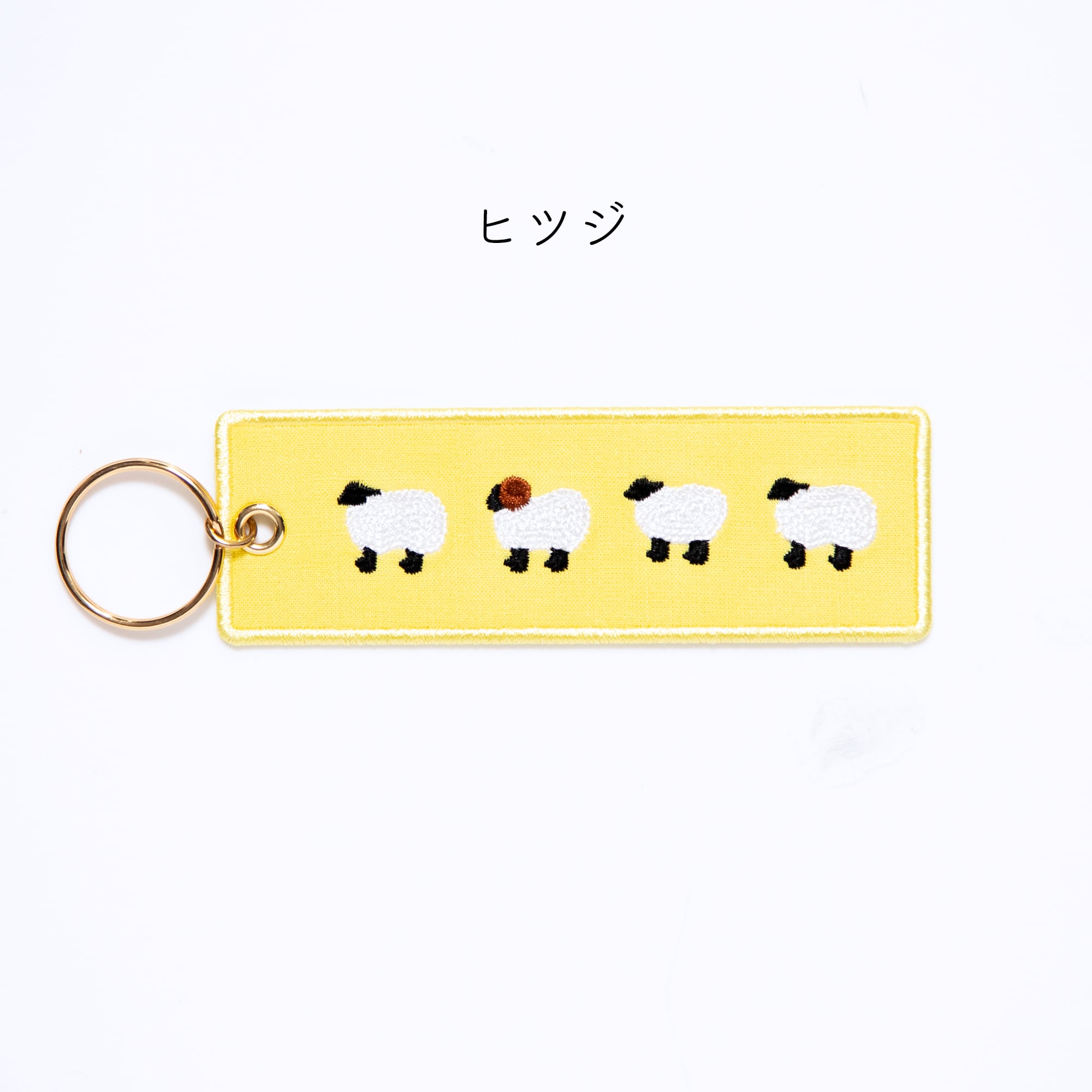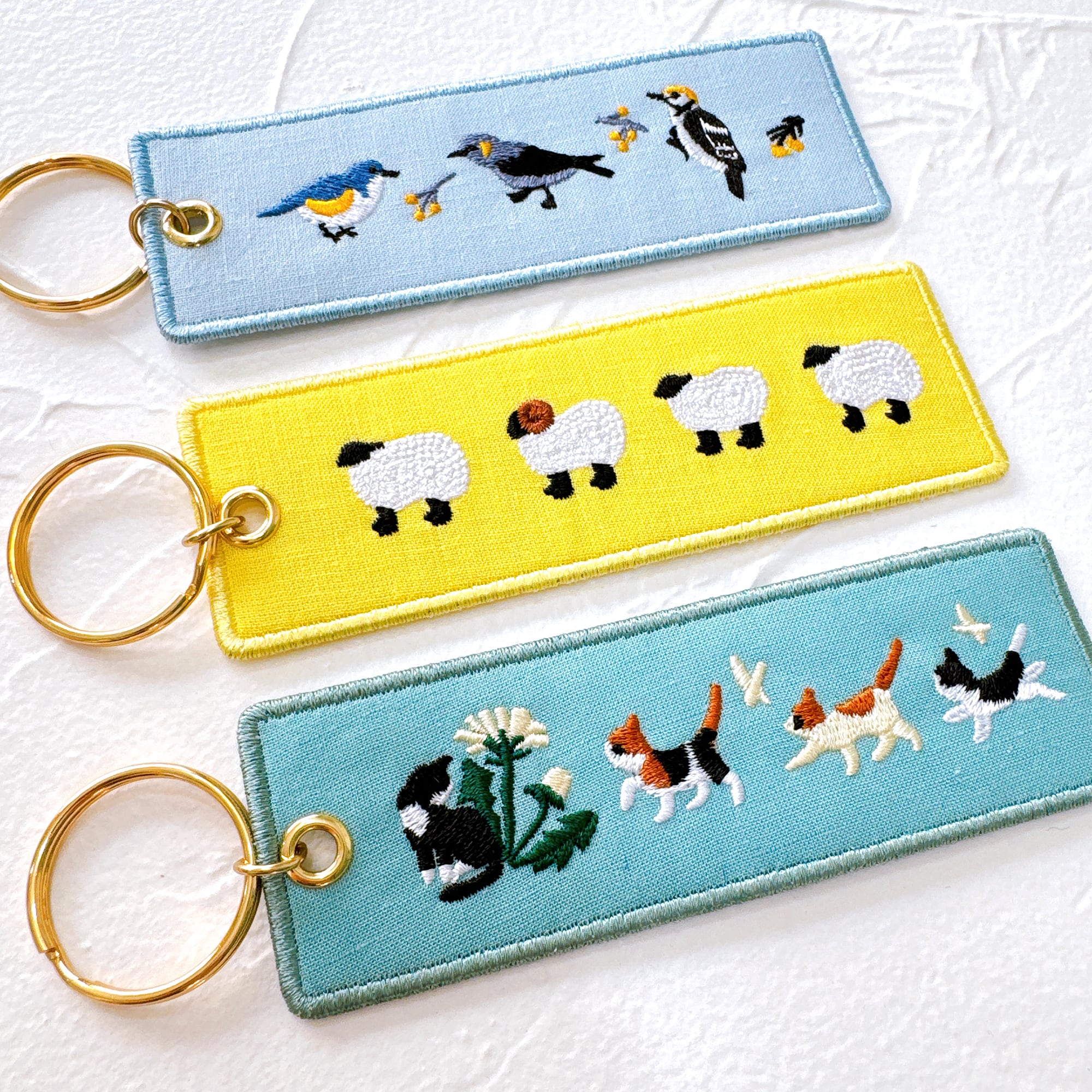 縦長のベースに動物たちが並んでいる刺繍がほどこされたキーホルダーです。