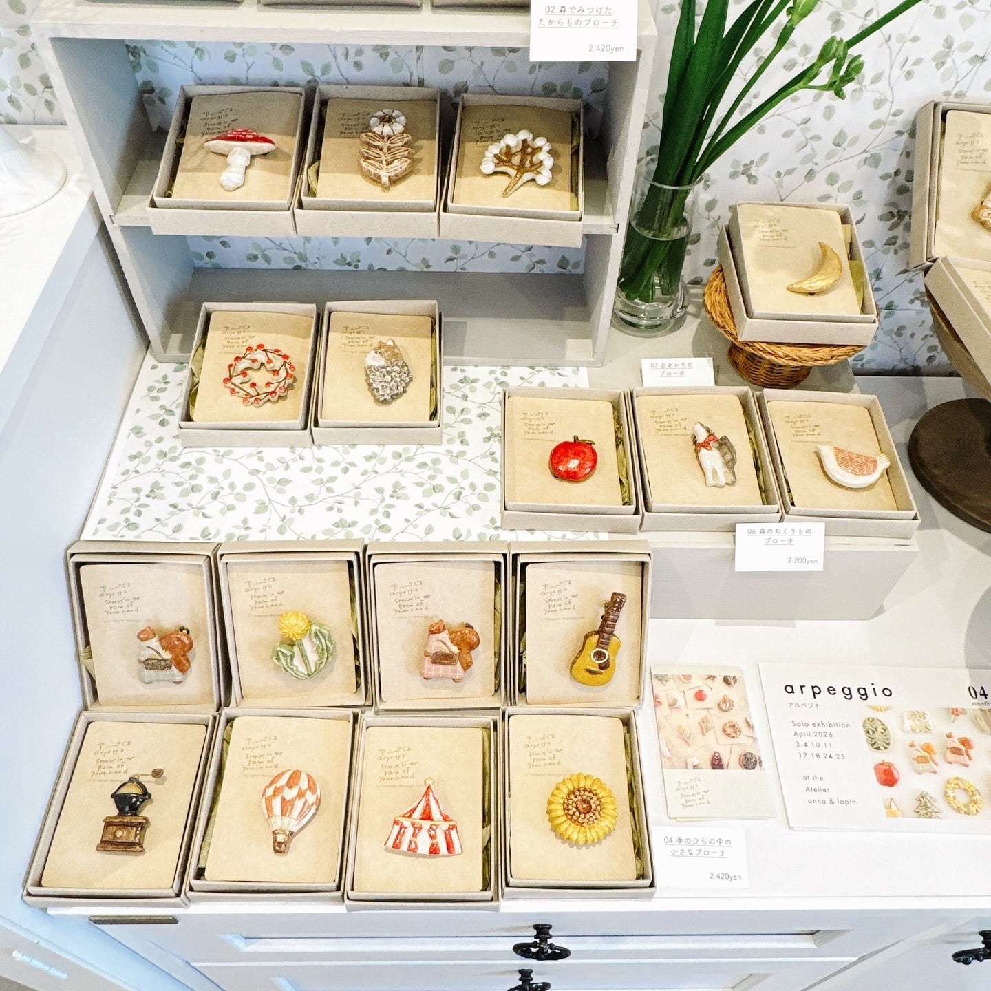 4月の1ヶ月間(通販は〜4/26まで)刺繍道具展「Atelier アンナとラパン」での展示販売を行っている、陶土を使ってブローチを作っているアルペジオさんの作品です。