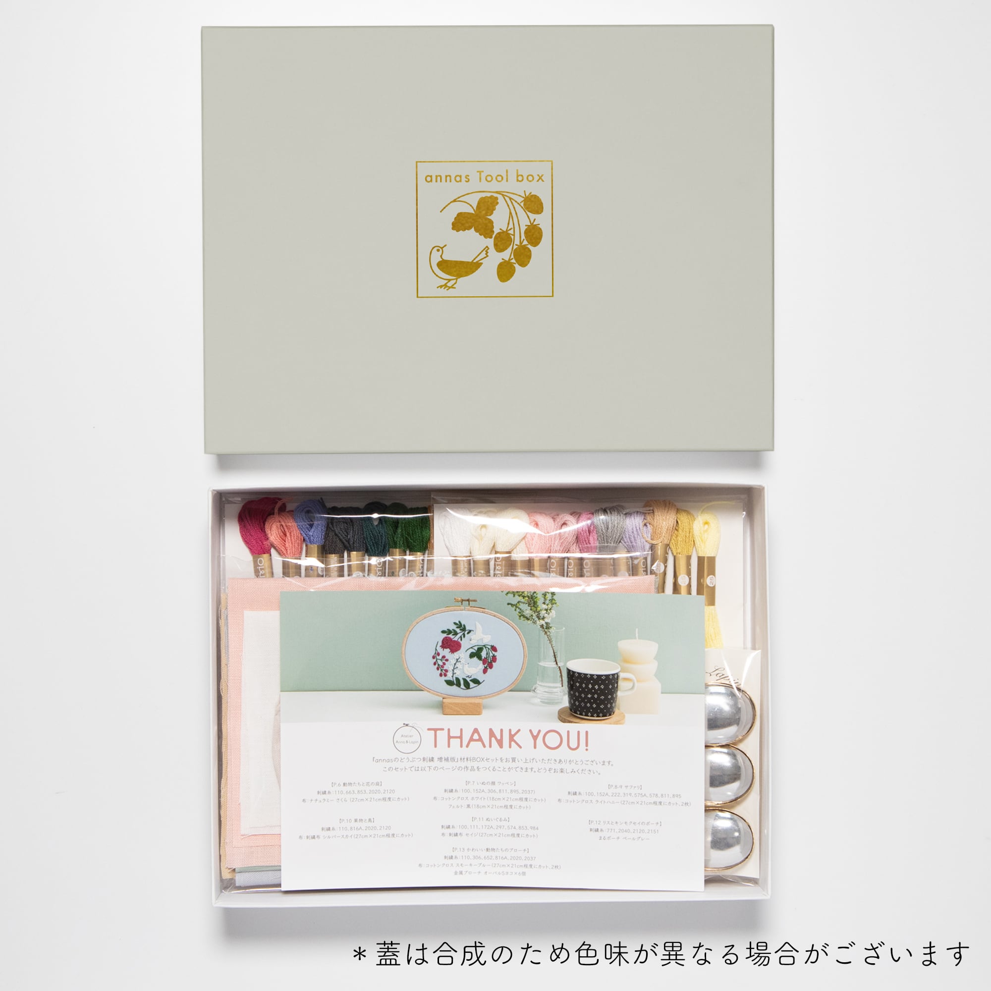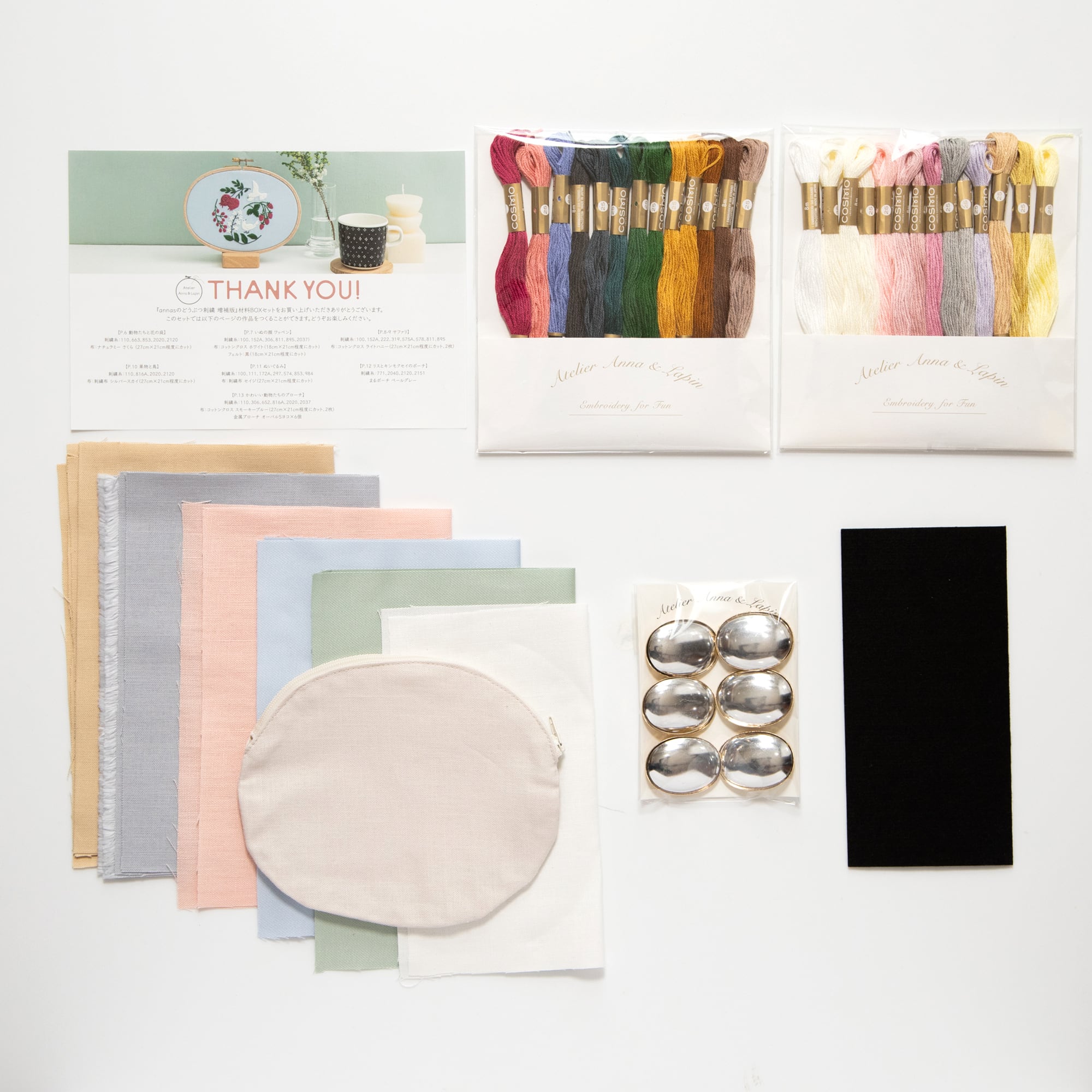 新刊『annasのどうぶつ刺繍 増補版』と材料が一緒になった限定のセット。